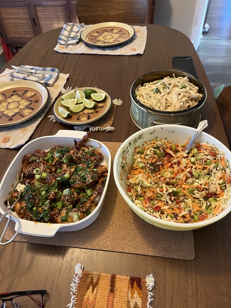 February 2024. One of my favorites. Vietnamese wings, Asian slaw and garlic noodles. The Asian slaw was awesome, have been asked to make it again weeks later. The noodles were so easy to make, wing sauce was a marinade, and the slaw had so many ingredients I was chopping for what felt like hours, but so good.
