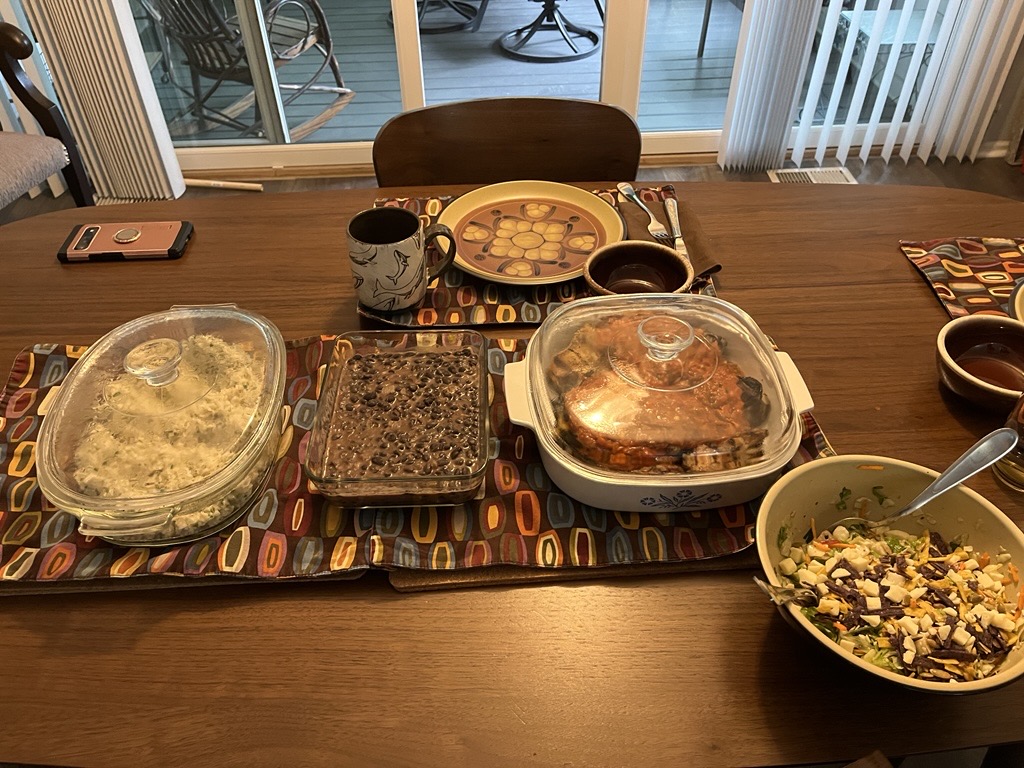 May 2024 – Not sure what this dish is. I see mashed potatoes, probably with tons of garlic and butter. Black beans, some kind of chicken thigh dish and a Trader Joes bag salad.