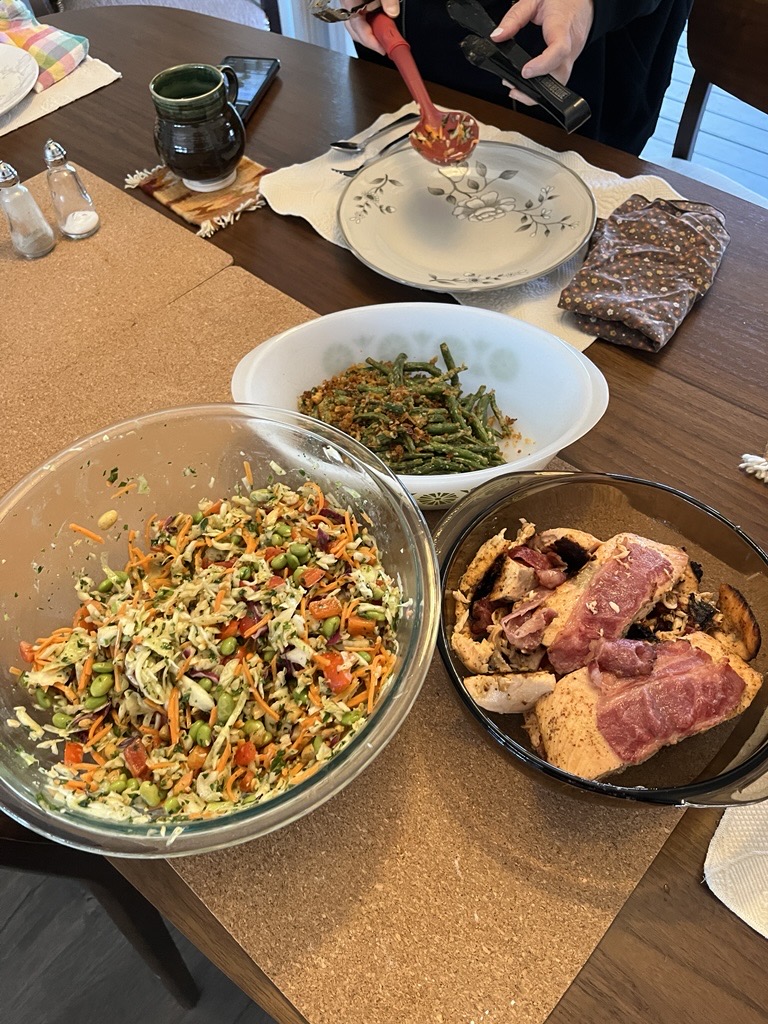 March 2024. There is that Asian Slaw with ginger dressing again. This time paired with grilled salmon with a honey mustard glaze and topped with beef bacon, and grilled zucchini and onion wedges. Of course you can top the salmon with pork bacon. I should have precooked the bacon before grilling. Otherwise, flavors were great together. Also paired with oven grilled green beans with French onion/panko breadcrumb topping.